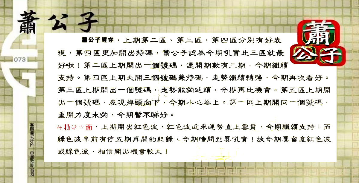 | 主题 :073期:六合皇金句/老总论码/萧公子/林大师/五行夺码/老总信箱截 |