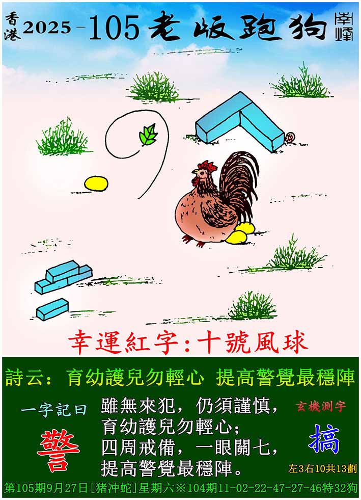 | 主题 :105期老版跑狗一字記之曰:【警】 玄機測字:《搞》 |
