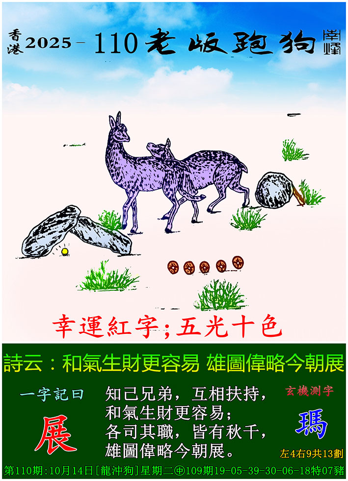 | 主题 :110期老版跑狗一字記之曰:【展】 玄機測字:《瑪》 |