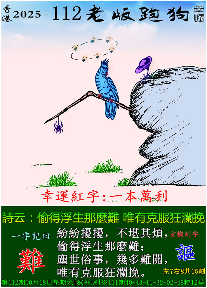| 主题 :112期老版跑狗一字記之曰:【難】 玄機測字:《謳》 |