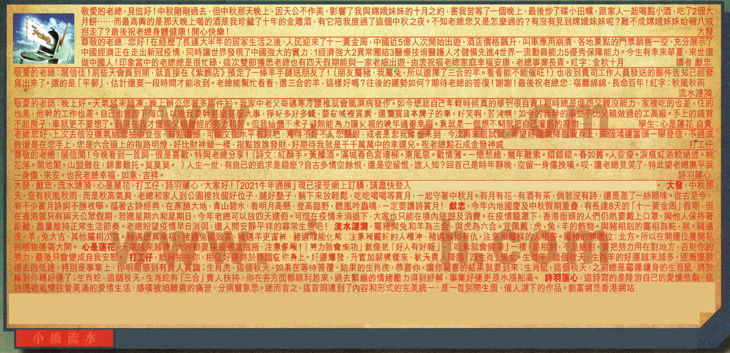 【2】尊敬的老總:您好!在經歷了長達大半年的居家生活之後,人民迎來了十一黃金周,中國近5億人次開始出遊,酒店價格飆升,叫車應用崩潰,各地景點的門票銷售一空,充分展示了中國經濟正在走出新冠疫情,同時讓世界發現了中國強大的實力: 1經濟強大2異常團結3醫療技術醫護人才儲備先進4世界一流動員能力5優秀保障能力。今生有幸來華夏,來世還做中國人!印象當中的老總總是很忙碌,這次雙節獲悉老總也有四天假期能與一家老細出遊,由衷祝福老總家庭幸福安康,老總事業長青。紅字:金秋十月 ---讀者獻忠