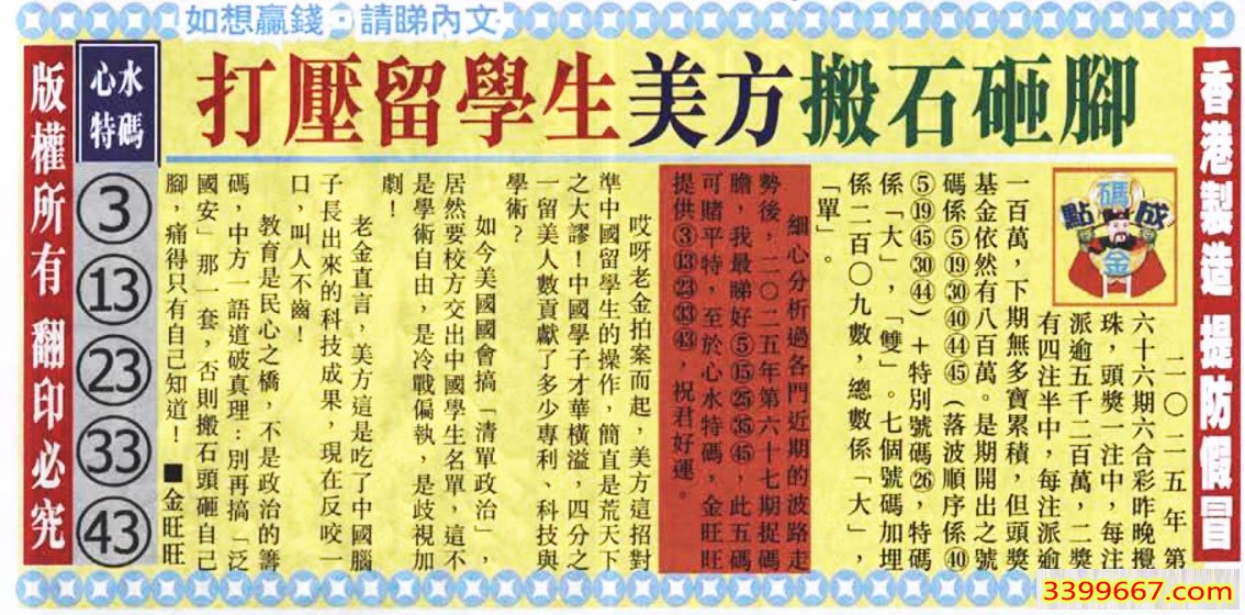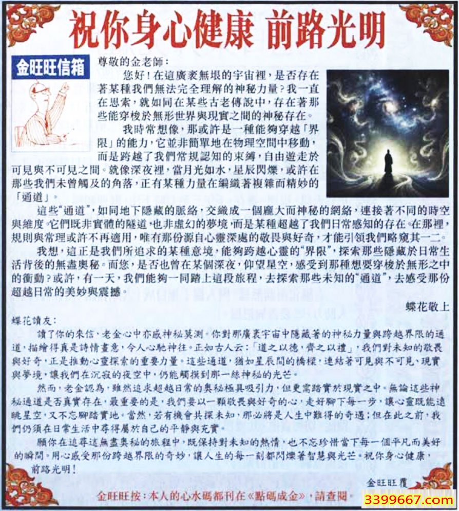 | 主题 :067期:金旺旺信箱彩民推荐→→《祝你身心健康 前路光明》 |