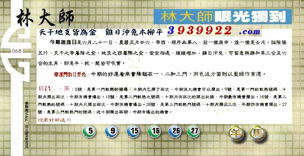 | 主题 :068期:六合皇金句/老总论码/萧公子/林大师/五行夺码/老总信箱截 |