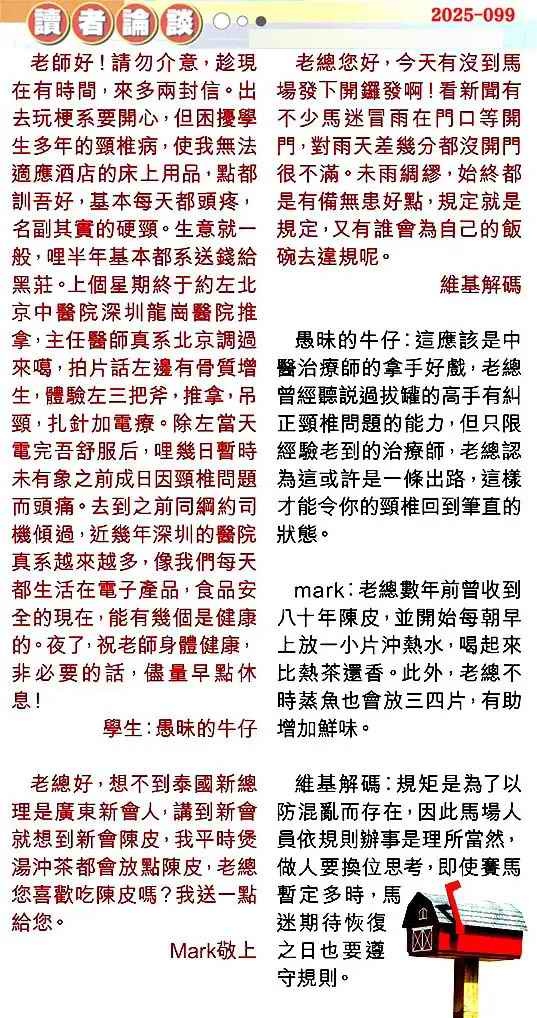 | 主题 :099期:彩民推荐贴信读者论坛 |