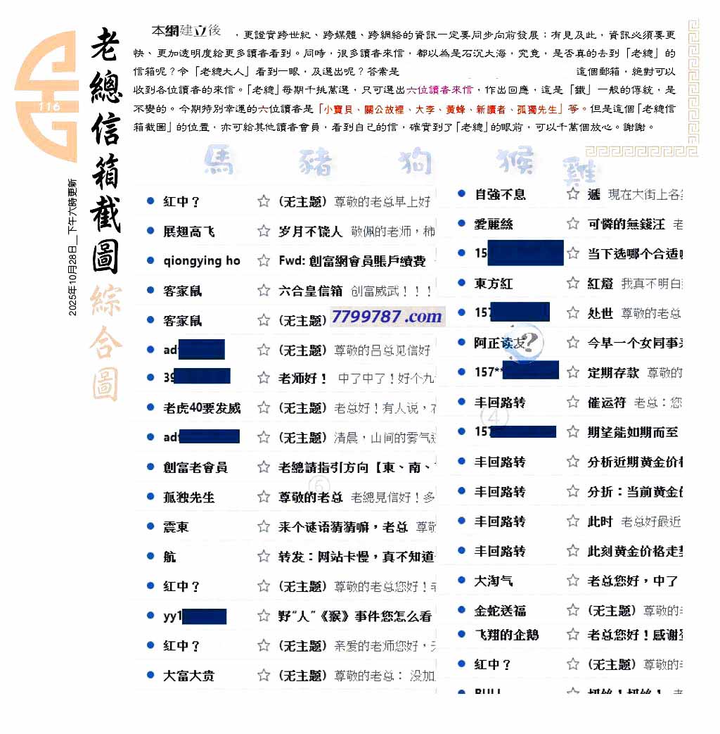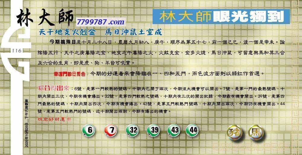 | 主题 :116期:六合皇金句/老总论码/萧公子/林大师/五行夺码/老总信箱截 |