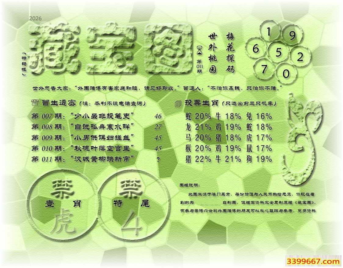 | 主题 :011期藏寶圖 新:因想后湖题柱处 老:汉城黄柳映新帘 禁:虎 禁:4尾 |