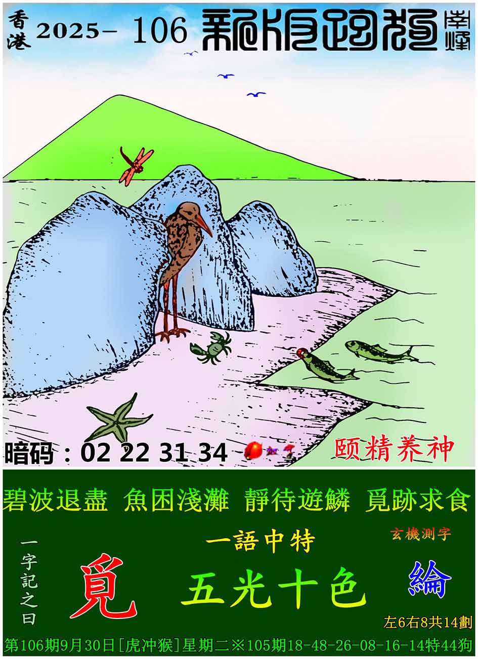 | 主题 :106期:新版跑狗一字記之曰【覓】 玄機測字:【綸】 |
